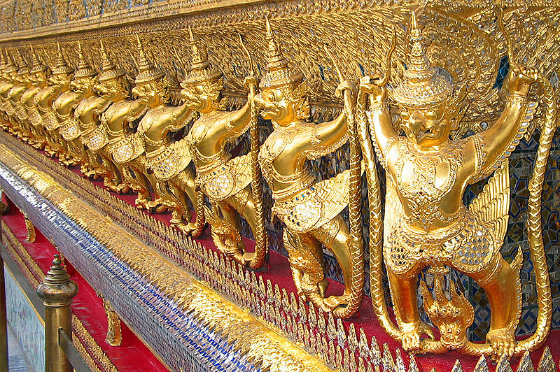 龍(蛇)と対立関係にあるのがカルラ(Garula:パーリー語/ガルダGaruda:サンスクリット語)です。仏教においては金翅鳥(こんじちょう)として尊ばれ、龍と共に仏を守護する存在ですが、インド神話では人々に恐れられているナーガ族(龍・蛇)を退治する聖鳥として尊ばれています。カルラは、一日に一頭の龍王と五百の小龍を食べるとされています。恐ろしい存在である龍(蛇)をとてつもない量を食べるというところに、この鳥に与えられた超越性が感じられます。さらに日本では、カルラは烏天狗のモチーフとなりました。龍を食べるということではもう一つ孔雀が上げられます。孔雀も仏殿や法具の装飾にも多く取り入れられています。